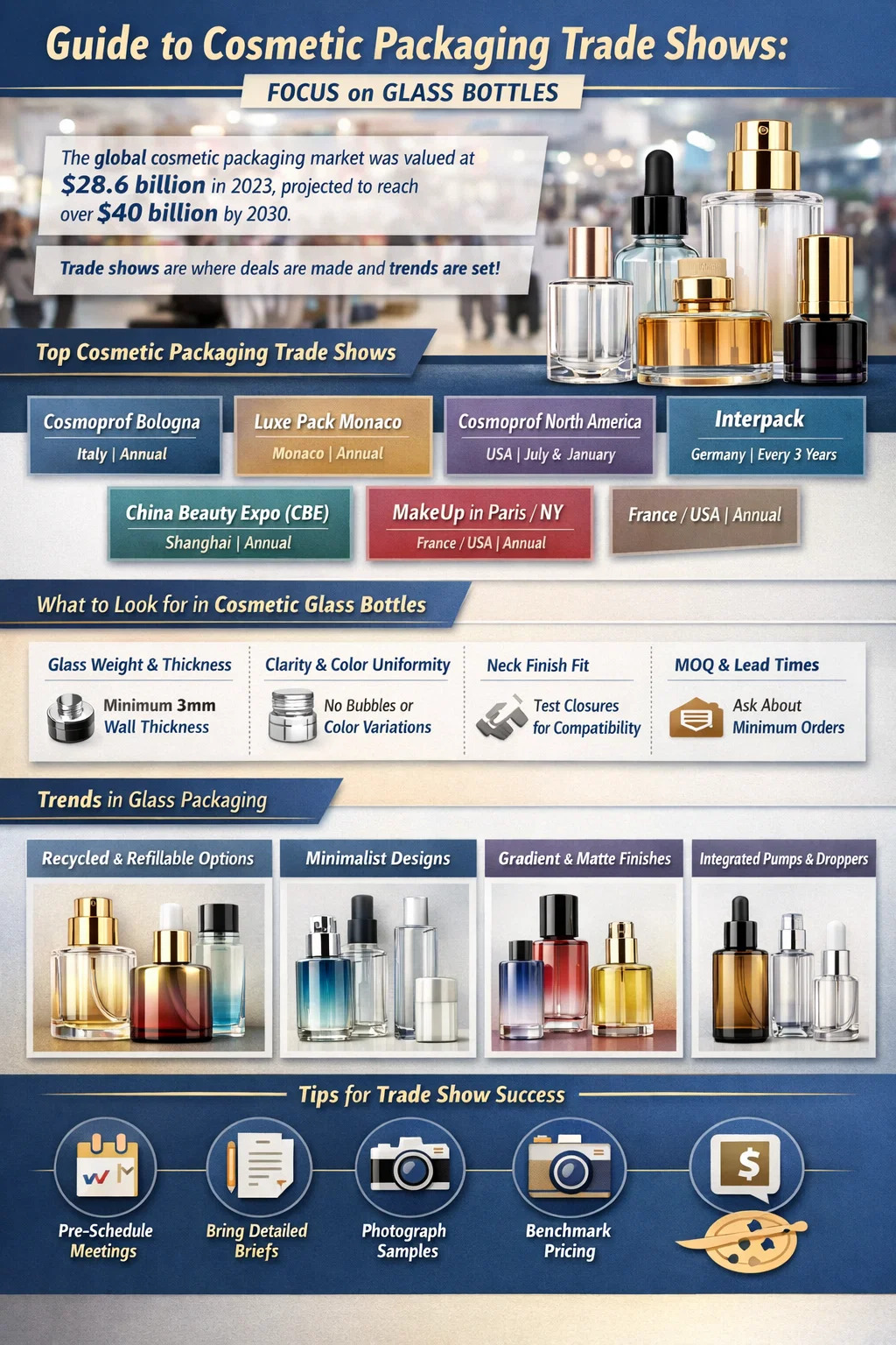 Jeśli pozyskujesz opakowania produktów kosmetycznych — zwłaszcza materiały najwyższej jakości, takie jak kosmetyczne szklane butelki — uczestnictwo we właściwych targach to jedna z najskuteczniejszych decyzji, jakie możesz podjąć. W jednym miejscu możesz porównywać setki dostawców, obsługiwać próbki fizyczne, bezpośrednio negocjować ceny i budować relacje, których replikacja za pośrednictwem poczty elektronicznej zajmuje miesiące. Światowy rynek opakowań kosmetycznych wyceniono na ok 28,6 miliarda dolarów w 2023 roku Według Grand View Research do 2030 r. wartość ta osiągnie ponad 40 miliardów dolarów. Targi to miejsce, w którym kształtuje się znaczna część tego rynku – zawierane są transakcje, wyznaczane są trendy i budowana jest sieć dostawców.