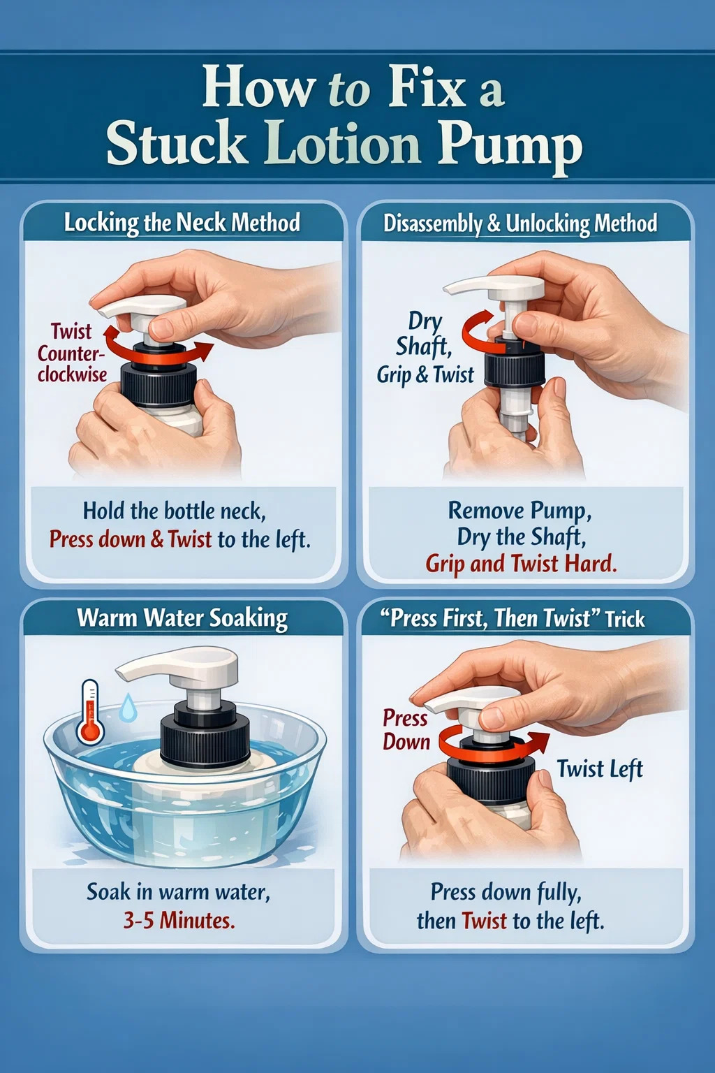 To dość frustrujące, gdy jesteś nowo zakupiony pompka do balsamu nie wyskoczy, niezależnie od tego, jak bardzo go przekręcisz. Dzieje się tak zwykle dlatego, że wewnętrzny mechanizm blokujący jest zbyt ciasny lub nie obracasz go we właściwy sposób.