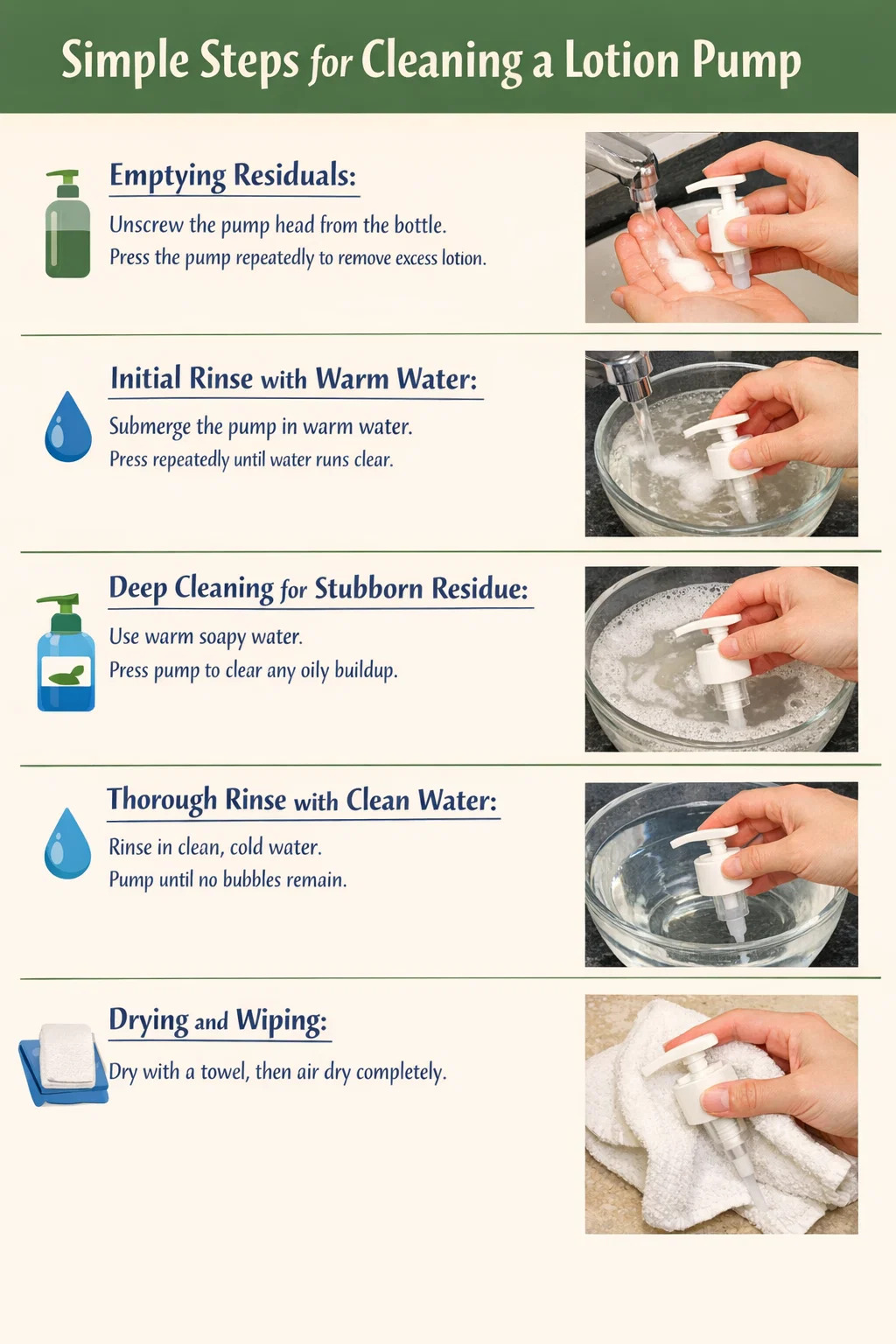 Przygotuj miskę z ciepłą wodą (nie używaj wrzącej wody, ponieważ może to spowodować odkształcenie plastiku). Zanurz całą pompkę balsamu w wodzie, naciskając kilkakrotnie pompkę, gdy jest zanurzona. Zobaczysz, jak biały balsam wydostaje się z tuby niczym mała chmurka. Kontynuuj naciskanie, aż będzie nalewana wyłącznie czysta woda.