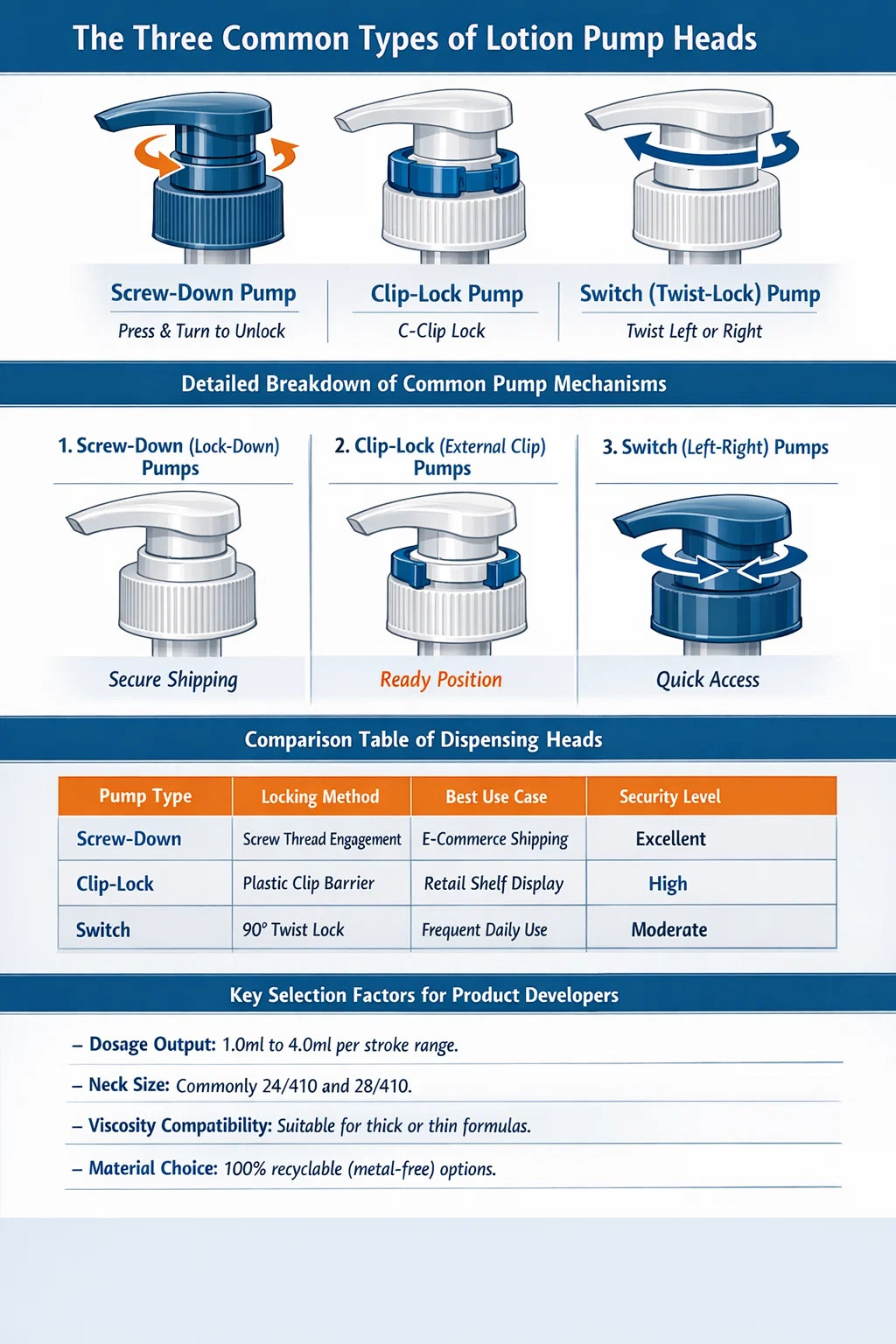 W branży opakowań termin Jakie są trzy popularne typy pomp? w szczególności odnosi się do mechanizmów blokujących i dozujących stosowanych do zabezpieczania płynów. Trzy najbardziej rozpowszechnione typy to Pompy przykręcane, pompy z blokadą zatrzaskową i pompy przełączające (z blokadą obrotową). . Każdy z nich został zaprojektowany tak, aby zapobiegać wyciekom podczas transportu, zapewniając jednocześnie określone wrażenia użytkownika podczas codziennego stosowania.