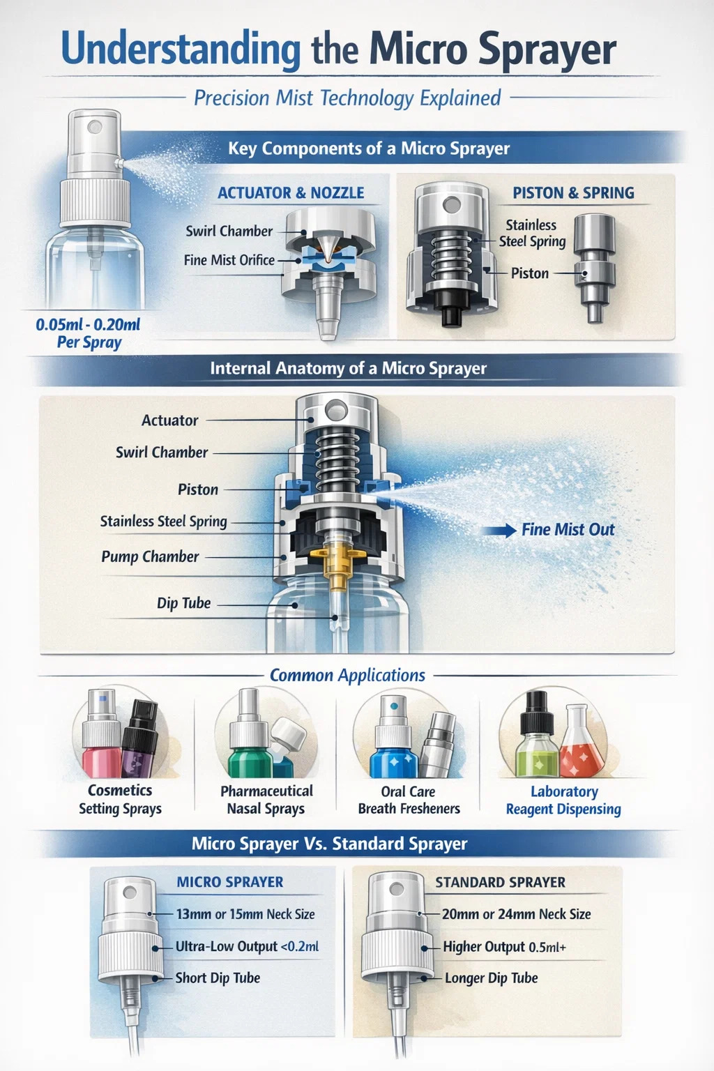 Aby odpowiedzieć na pytanie „Co to jest mikroopryskiwacz?” , jest to precyzyjnie zaprojektowane urządzenie dozujące zaprojektowane do przekształcania cieczy w wyjątkowo drobną, spójną mgiełkę przy bardzo małej objętości wyjściowej na skok. W odróżnieniu od standardowych opryskiwaczy spustowych stosowanych do sprzątania w gospodarstwie domowym, a mikro opryskiwacz zazwyczaj rezygnuje pomiędzy 0,05 ml i 0,20 ml produktu na raz, co czyni go idealnym wyborem do cieczy o wysokiej wartości, gdzie najważniejsza jest kontrola dozowania i delikatne nakładanie.